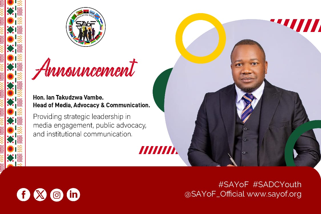Gaborone , BotswanaThe Southern Africa Youth Forum (SAYoF) has announced the appointment of Hon. Ian Takudzwa Vambe as its new Head of Media, Advocacy, and Communications Cluster. This appointment highlights Hon. Vambe’s commitment to empowering youth across Southern Africa through effective advocacy and communication strategies.